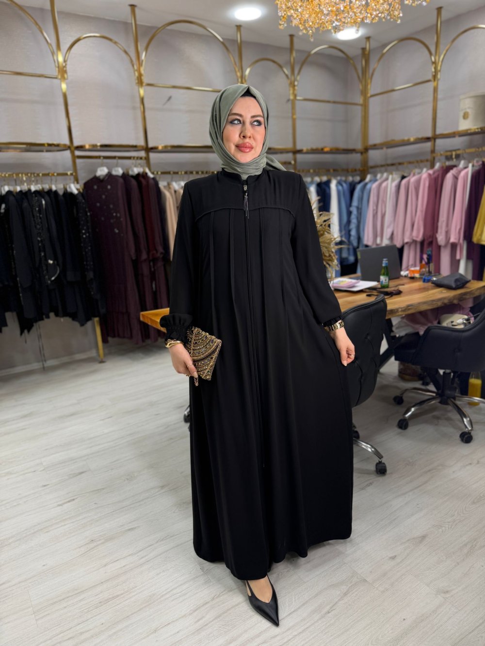Kumaşı medine ipeğidir. Önü fermuarlıdır. Cep mevcuttur.