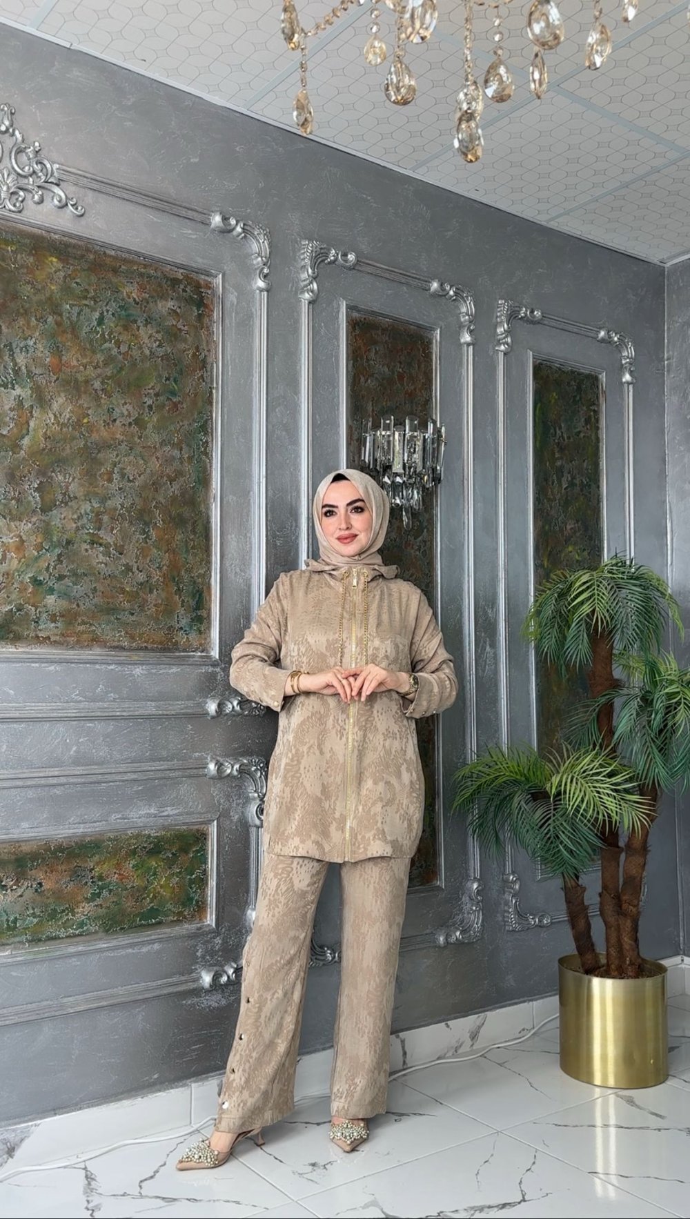 Qupra Kumaştır. Ceket Boydan Fermuarlı,Kapşonlu ve Yaka Zincir Aksesuarlıdır. Kol ve Pantolon Metal Çıtçıt Detaylı,Ceket Sahte Cep Detaylıdir. Pantolon Beli Lastiklidir.