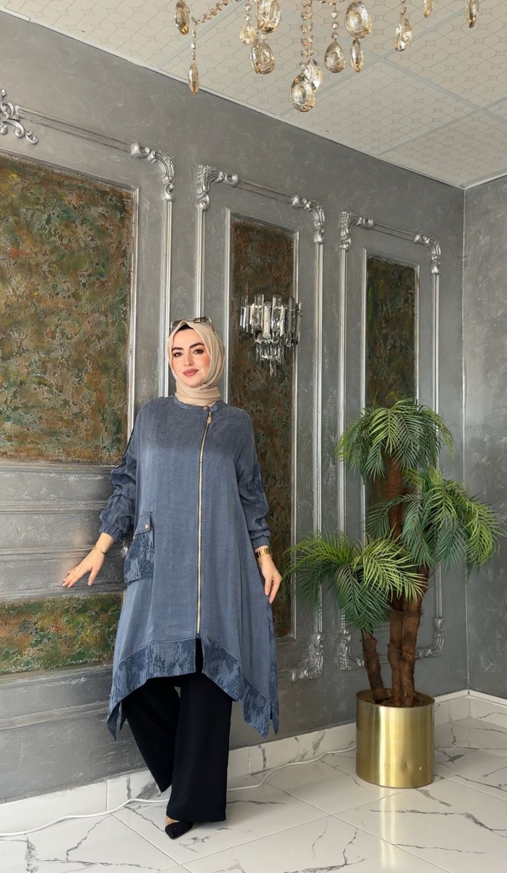 Taşlanmış İpek Qupra Kumaştır. Boydan Fermuarlı, Körüklü Cep Metal Düğme Çıtçıt Kapaklıdır. Kol Ağızı Lastikli,Kol Kuşgözü Aksesuar Şeritlidir.Eteği Asimetrik Kesimdir.