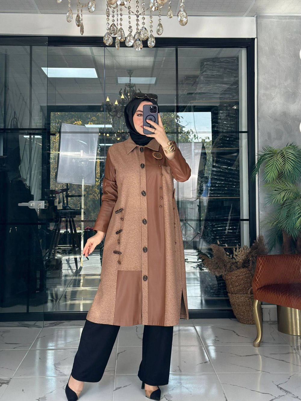 Kumaşı tüvit kumaştır. Deri kombinlidir. Cebi yoktur. Önü düğmelidir.