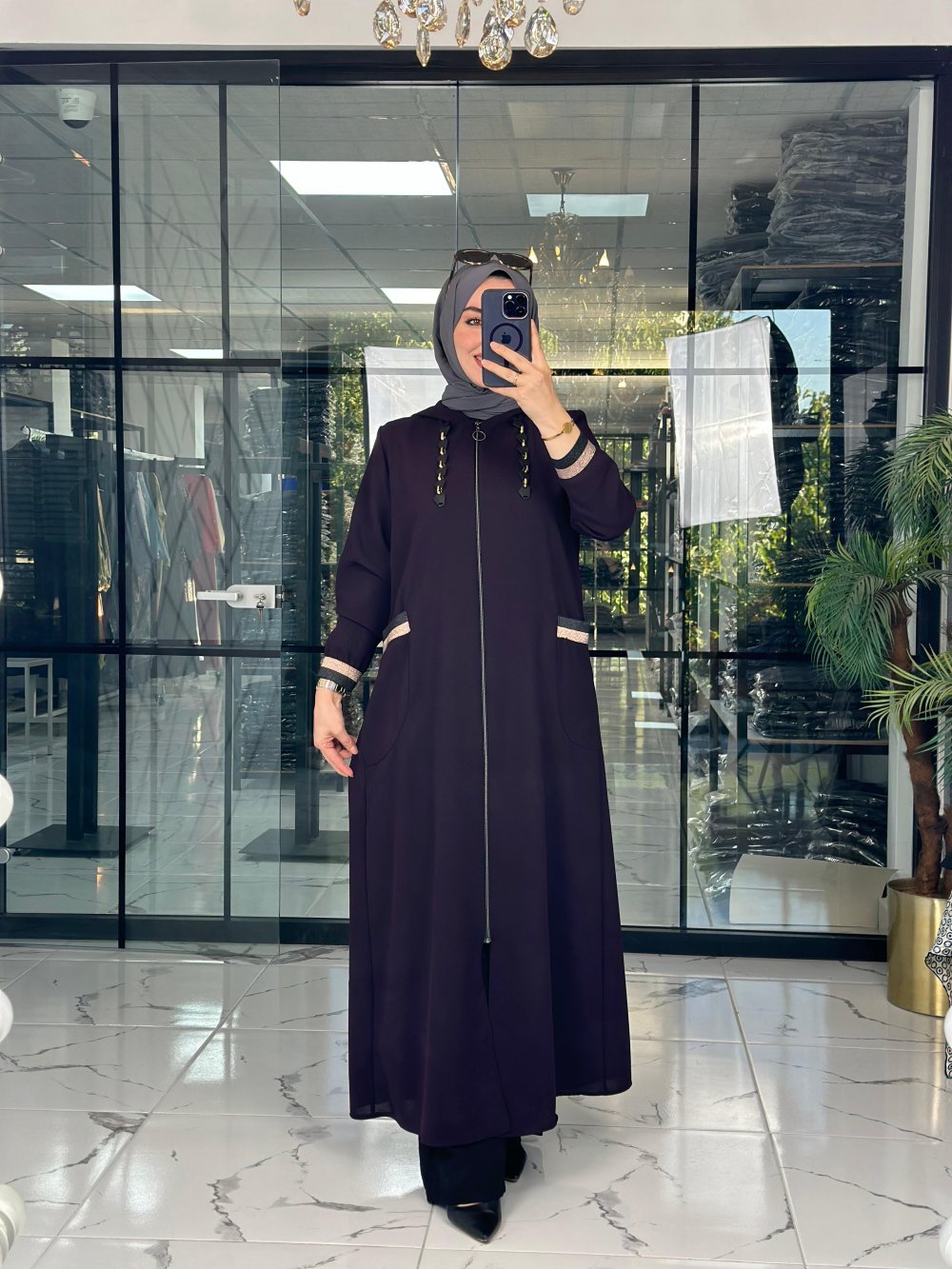 Kumaşı kreptir. Şapkası sabittir. Cepleri mevcuttur.