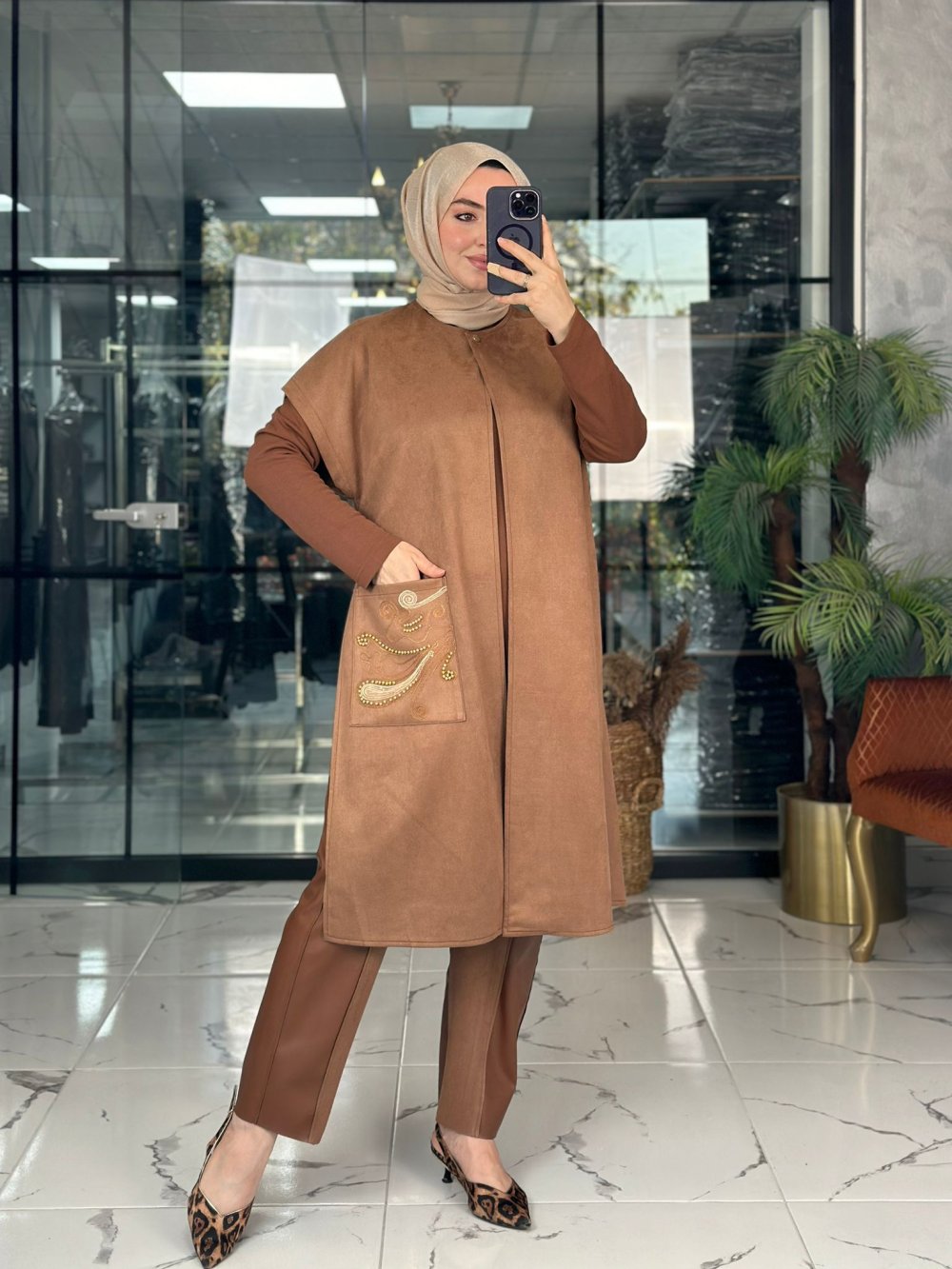 Süet Tasarım Yelek Taba Taba