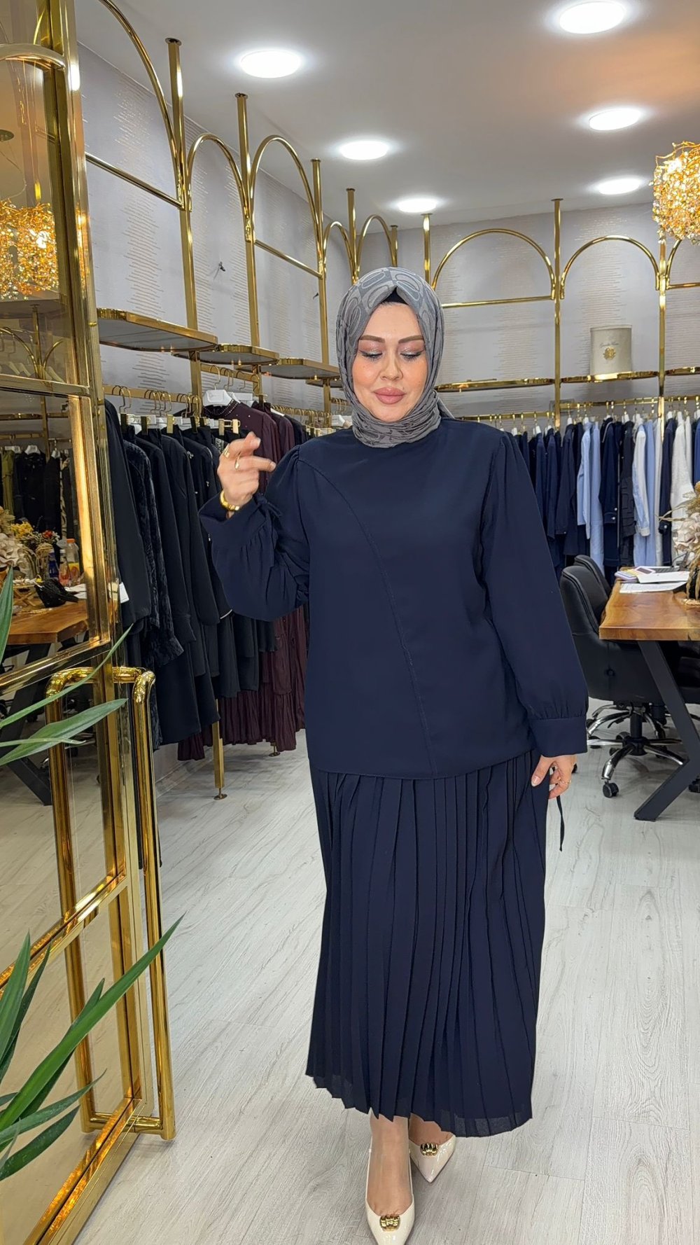 Kumaşı kreptir. Arkası yarım fermuarlıdır. Etek beli lastiklidir.